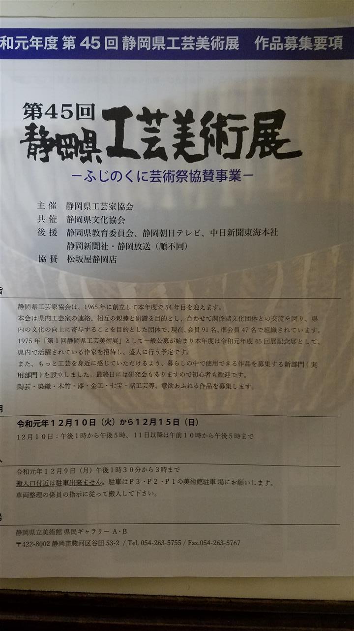 12月10日から静岡県工芸美術展が始まります。 従来の美術工芸部門だけではなく、 今年からは 実用部門が新設され 実用小品での 出品が可能になります。 また 県内ギャラリーにも参加していただき 活動の幅が広がります。 カルチャーなどの生徒さんでも出品可能です。 出品要項は静岡県工芸家協会のホームページからダウンロード、 または協会事務局にお問い合わせください。 県内最大級の 工芸の展覧会です。 どしどし出品していただければと思います。